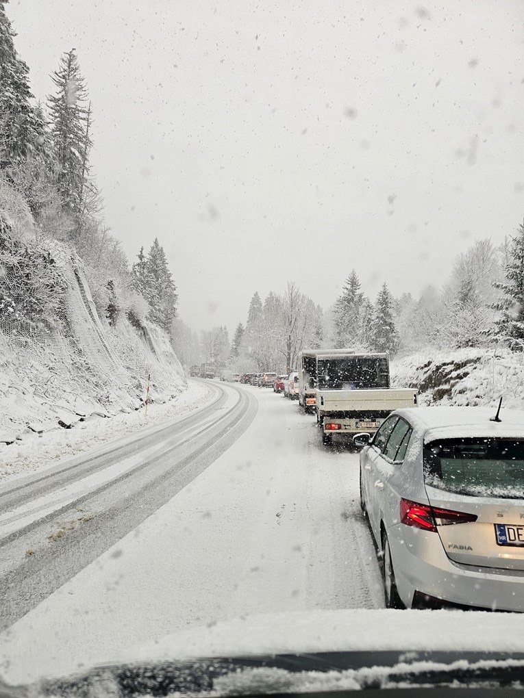 „Зимските служби беа изненадени од снегот“, пишува еден читател, кој додаде: „На патот ДЦ1 преку Лика возиме по завеани патишта, слалом меѓу возила со летни гуми.“