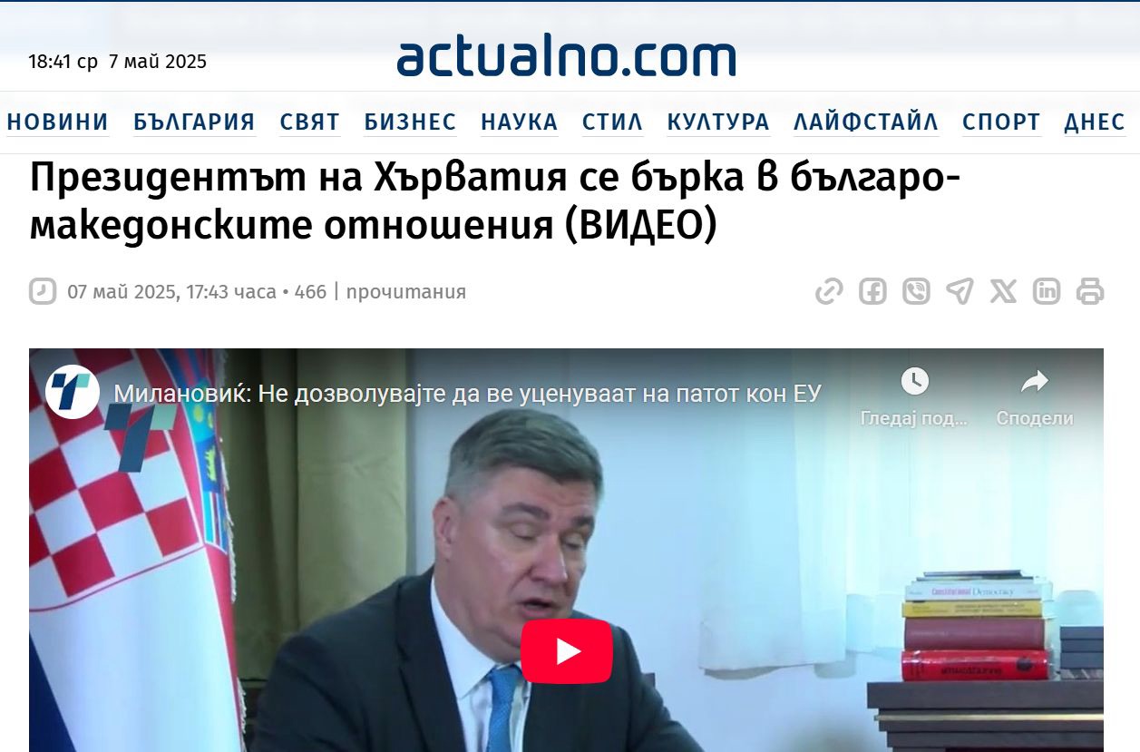 Под наслов „Претседателот на Хрватска се меша во бугарско-македонските односи“, од вебстраницата „Актуално“ го потенцираа токму наведениот совет од Милановиќ.
